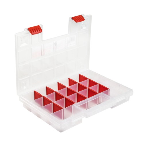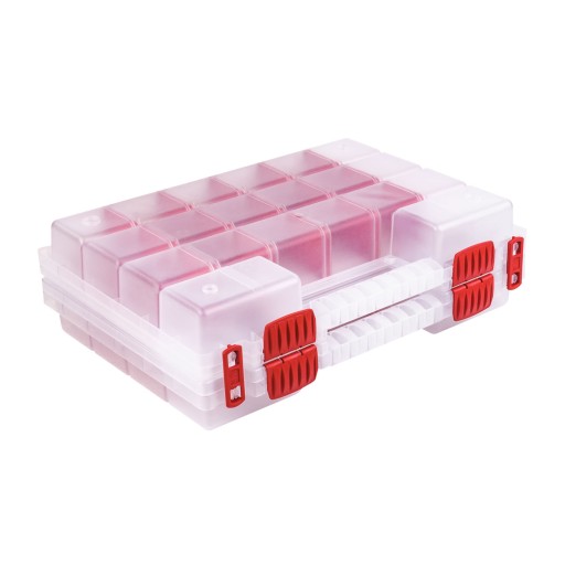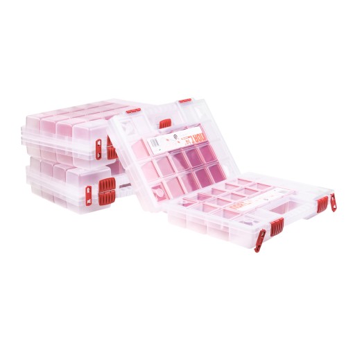 Organizery z serii NorT wyróżnia transparentna powierzchnia, umożliwiająca przejrzyste i dokładne sortowanie rozmaitych drobiazgów. Zawartość jest jeszcze lepiej widoczna. Rozmiar i ilość przegródek można regulować, a przechowywane przedmioty nie mieszają się ze sobą. Dzięki solidnej rączce organizer można bez trudu przenosić. NORT DUO to komplet składający się z dwóch organizerów spiętych ze sobą klipsami. Można je bez trudu rozłączyć i używać osobno.