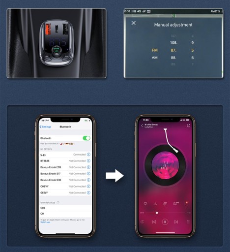 Transmiter FM oraz technologia Bluetooth pozwalają na słuchanie zgromadzonej na smartfonie muzyki poprzez radio. Wystarczy sparować telefon z gadżetem, a następnie wyszukać odpowiedniej częstotliwości na samochodowym odbiorniku.