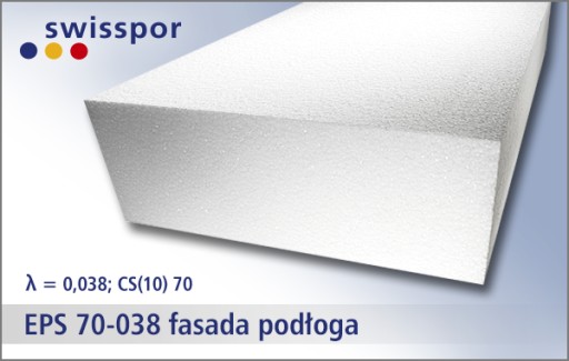 Swisspor styropian biały EPS 70 Fasada / Podłoga: lambda 0,038 / 2,1 t/m2 - Styropian eps70 ma zastosowanie zarówno jako styropian podłogowy ( pod wylewki - małe i średnie obciążenia ) oraz jako najlepszy i najbardziej wytrzymały produkt przy zastosowaniu jako styropian elewacyjny. Białe płyty styropianowe o podwyższonych parametrach technicznych. Produkcja płyt styropianowych EPS 70 fasada/podłoga nakłada na producenta konieczność stosowania bardziej rygorystycznych reżimów technologicznych podczas produkcji. Jest to uniwersalny materiał termoizolacyjny standardowo wykorzystywany głównie do izolacji termicznej i akustycznej fasad i podłóg w budownictwie mieszkaniowym i przemysłowym. Obniżony, bardzo dobry jak na styropiany białe współczynnik przenikania ciepła - 0,038. Gwarantowana jakość - minimum 13,5 kg / m3. Zalecana warstwa styropianu na ścianę to 15-25 cm oraz na podłogę 10-20 cm ( w dwóch warstwach ).
