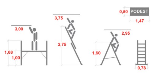 - Możliwość użytkowania jako podestu oraz drabiny 2-elementowej (np. w pozycji wolnostojącej Ʌ oraz przystawnej /)