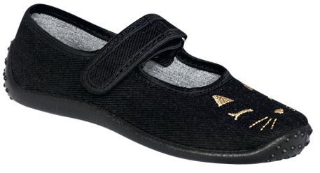 Obuwie dziewczęce wykonane z bawełny w czarnym kolorze zapinane na rzepa ozdobione złotym haftem. Wnętrze buta wykonane z naturalnej bawełny, a spód z elastycznego bezftalanowego PVC w czarnym kolorze. Usztywniana piętka.