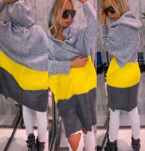 Trójkolorowy sweterek z kapturem i długimi rękawami zakończonymi ściągaczem. Kardigan o fasonie oversize zalecany dla Pań noszących rozmiar S M L XL XXL. Ze względu na połączenia kolorystyczne Kardigan Multi można wykorzystać do większości stylizacji. Z łatwością dopasujesz go do swoich ulubionych spodni i T-shirtu. Idealne do szkoły, do pracy, na randkę czy spotkanie z przyjaciółmi! Narzutka Multi dostępna w naszym e-sklepie w kilku wariantach kolorystycznych, więc nie wahaj się i wybierz ten, który będzie dla Ciebie idealny.