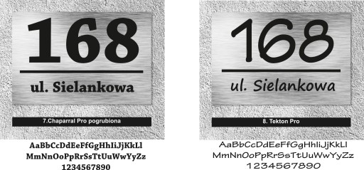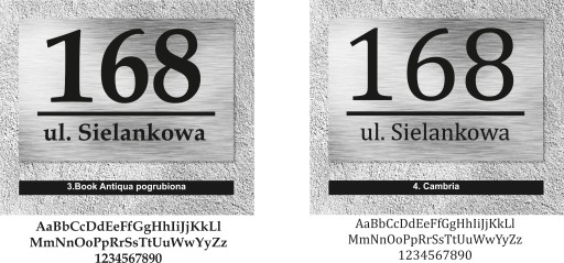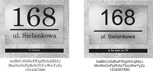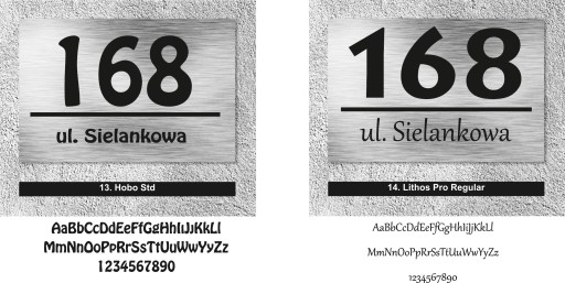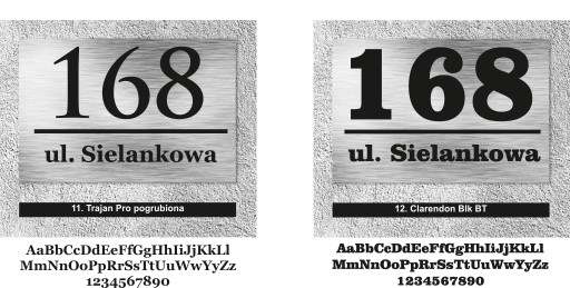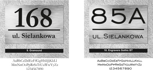Poniżej przedstawiamy czcionki, z których wykonamy Twoją tabliczkę. Wybierz tę, która odpowiada Ci najbardziej i napisz swój wybór w informacji dla sprzedawcy w trakcie składania zamówienia. Nie zapomnij o podaniu numeru domu i nazwy ulicy.