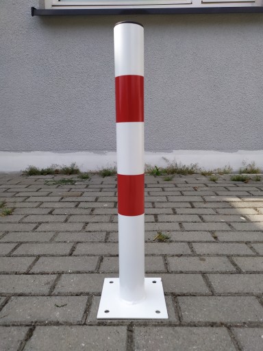 Słupek parkingowy na podstawie, wykonany z rury fi60 o wysokości 60cm w kolorze białym, z szerokimi, czerwonymi pasami odblaskowymi.