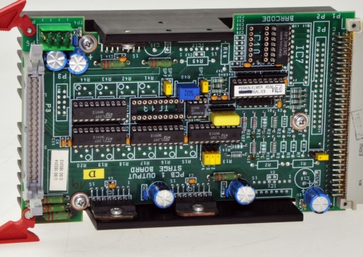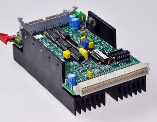 Używany, pochodzący z demontarzu urządzenia laboratoryjnego moduł sterownika silników krokowych zbudowany na bazie trzech układów scalonych: L298KV - Dual Full-h Bridge Motor Driver IC Texas Instruments.