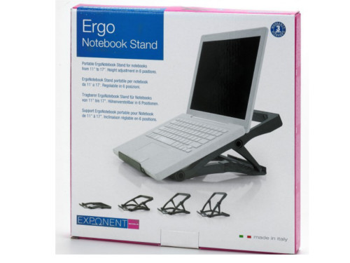 Jeżeli dużo pracujesz na laptopie, w biurze, w podróży czy w domu, a do tego cenisz sobie komfort pracy, zdrowie, elegancję i korzystną cenę - mamy coś odpowiedniego dla Ciebie. Przenośna podstawka pod laptopa marki Exponent World pozwala na wygodną pracę na laptopach o przekątnych od 11" do 17". Wyposażona została w antypoślizgowe podkładki, utrzymujące urządzenie cały czas w odpowiedniej, stabilnej pozycji. Podstawkę pod laptopa można ustawić w 6 pozycjach, co pozwala na dopasowanie ustawienia do zajmowanej podczas pracy pozycji. Jeżeli dużo pracujesz poza biurem i często podróżujesz, nie stanowi to problemu. Prezentowana podstawka pod laptopa łatwo się składa, a po złożeniu ma zaledwie 3 cm grubości. Włoska firma wykonała podstawkę w kolorze czarnym z wysokiej jakości tworzywa sztucznego i zadbała również o jej elegancki wygląd. Wygoda, elegancja, niska cena, te cechy wyróżniają podstawki pod laptopa Exponent World.
