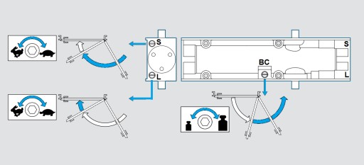 Regulowana szybkość zamykania drzwi, szybkość zatrzaskiwania, oraz funkcji back-check za pomocą zaworów regulujących