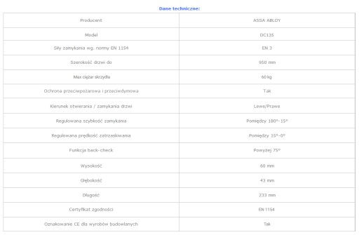 Samozamykacz stosowany w drzwiach zewnętrznych i wewnętrznych, prawych/lewych, przeciwpożarowych i dymoszczelnych o szerokości skrzydła do 950 mm i wadze do 60 kg. Siła zamykania 3 zgodnie z normą EN1154.