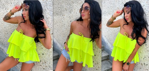 Niepowtarzalnego wyglądu nadają oryginalne falbany , fason hiszpanki !! Góra regulowana sznurkiem ze złotymi końcówkami.