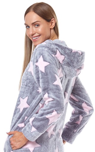 Softowy kombinezon z kapturem. Zapinany na zamek. Piżama z praktycznymi kieszeniami. Całość w gwiazdy.