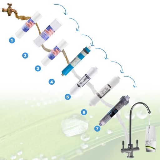 Woda przepływająca przez system poddana jest 7 stopniowej filtracji na którą składają się: