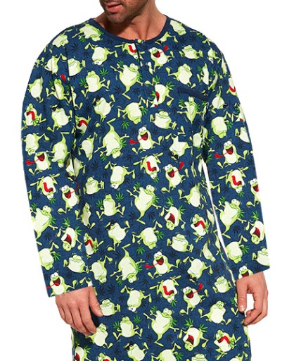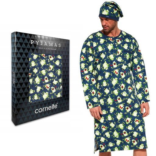 Cornette 110 to męska koszula nocna wykonana w 100% z miękkiej i miłej w dotyku bawełny. Krótkie rękawy oraz luźny krój zapewniają wysoki komfort podczas noszenia. Dekolt zapinany jest na guziki a przy piersi zastosowano praktyczną kieszonkę. W zestawie znajduje się także dopasowana czapeczka.