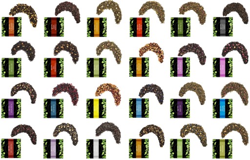 - „Zielona Truskawka”, składniki: herbata zielona gunpowder, truskawka liofilizowana grys, bławatek biały, aromat truskawkowy.
