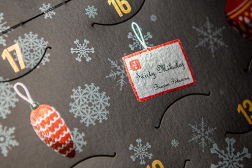 Saszetki herbat umieszczone na wyjątkowym kalendarzu w kształcie choinki, wykonanym z tektury premium o obustronnym zadrukowaniu i specjalnych uszlachetnieniach.