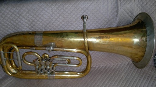 Tuba w stroju in"Es" przedwojenna, Polska, po przeglądzie, nie ma luzów na tłokach, stroi, stan jak na zdjęciach, lekkie wgniecenia nie mają wpływu na brzmienie. znak firmowy TRADE- MARK. N.S.I.S. Bochemia. W.STOWASSERA-SYNOWIE. Fabryka instrumentów muzycznych. WARSZAWA-GRASLIC.