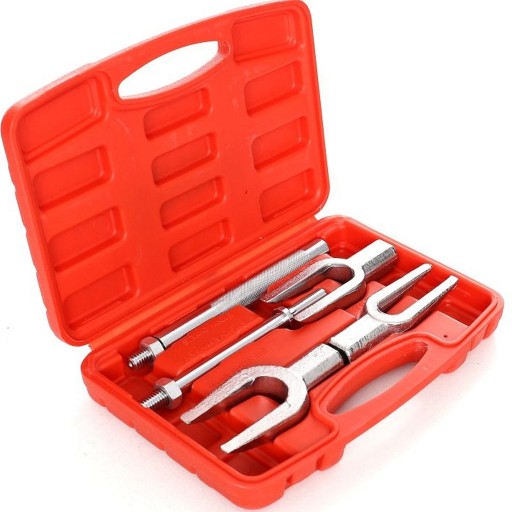 Zestaw zawiera 3 widelce o szerokości 17,4 mm,23,8 mm i 28,5 mm oraz rękojeść do pobijania młotkiem ręcznym i rękojeść do młotka pneumatycznego (udarowego). Ramiona widełek w ściągaczach posiadają trwałe i równe powierzchnie klinowe co pozwalają na łatwe i precyzyjne umocnienie zabezpieczonych sworzni oraz drążków. Ściągacze skracają czas pracy w serwisach samochodowych.