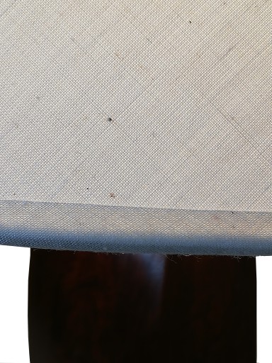 Abażur o średnicy 50 cm. (U DOŁU) i 22 cm. (U GÓRY), wykonany z tworzywa sztucznego imitującego naturalną tkaninę pokrytą delikatnymi cętkami widocznymi na zdjęciu.
