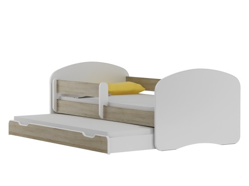 - posiada szufladę, w której znajduje się drugi stelaż oraz materac. Szuflada zamontowana jest na 6 gumowych kółkach, dzięki czemu nie rysuje podłogi podczas wysuwania