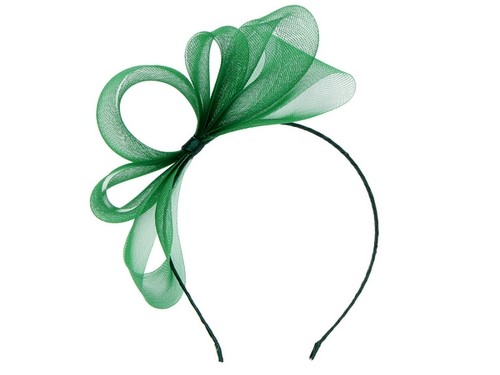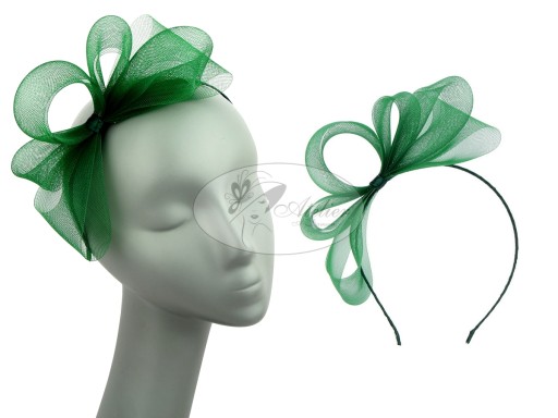 Satynowa opaska ozdobiona stroikiem z syntetycznej krynoliny. Opaska jest na metalowej podstawie, dzięki czemu można ją dopasować do kształtu głowy. Opaska bez ząbków. Jest to produkt szyty (nieprzyklejany).