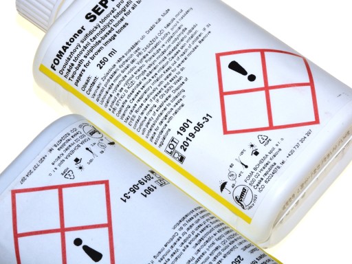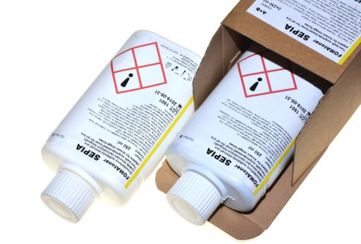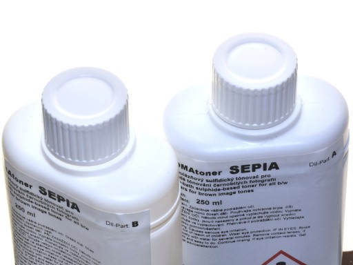 Opis towaru: Toner sepiowy dwu kąpielowy do barwienia odbitek czarno-białych na podłożu plastikowym i barytowym a także tradycyjnych filmów czarno-białych negatywowych i diapozytywowych. Odcień sepii zależy od kontrastu odbitki, rodzaju papieru, rozcieńczenia kąpieli, temperatury, długości odbielania i, barwienia itd. Gotowe kąpiele otrzymuje się rozcieńczając stężone roztwory z wodą w maksymalnym stosunku 1 do 9 czyli zestaw starcza na 2 razy 2,5 litra kąpieli. Opakowanie zawiera stężony odbielacz w płynie oparty o żelazicyjanek potasu - 250 ml. oraz barwnik 250 ml. Wydajność podana przez producenta to ok. 5 m. kw papieru. W praktyce zależy ona od stopnia rozcieńczenia i rodzaju papieru, np. baryty nasiąkając roztworami fizycznie zużywają kąpiele w większym stopniu niż papiery Plastikowe RC. Ciekawe efekty otrzymuje się odbielając odbitkę bardzo rozcieńczonym odbielaczem. Podczas barwienia na odbitce uwidaczniają się WSZYSTKIE błędy obróbki pozytywowej dlatego odbitki do barwienia należy przygotować z najwyższą starannością.