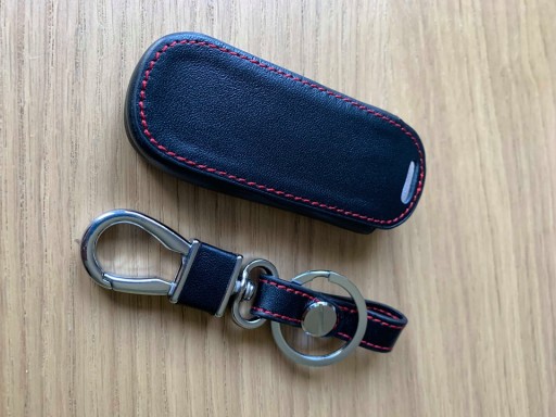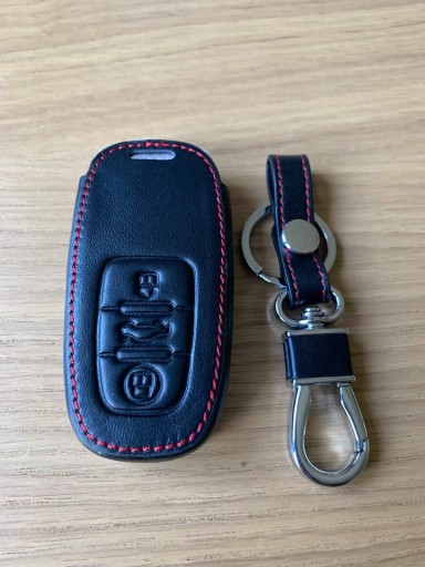 Eleganckie skórzane etui na kluczyk z 3 przyciskami do samochodów Audi. Pokrowiec jest estetycznie i dokładnie przeszyty czerwoną nicią dzięki czemu kluczyk ciasno wchodzi i dobrze się trzyma. Skóra jest bardzo dobrej jakości co chroni kluczyk przed zadrapaniami i otarciami, piachem, wszystko jest dobrze wykonane i prezentuję się wyśmienicie!
