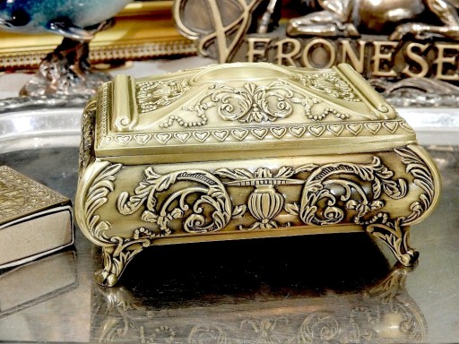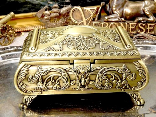 Zapraszam do zakupu efektownej , dość dużej szkatułki Jest wykonana ze stopu cynku, pokryta (platerowana) mosiądzem, ma kolor starego złota .
