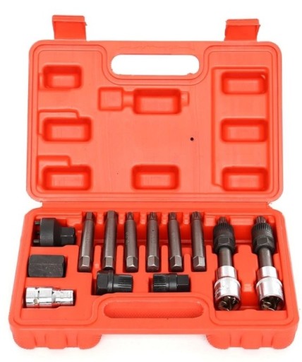 Bogaty zestaw kluczy do montażu i demontażu alternatorów ze sprzęgłem typu Bosch i Magneti Marelli.Dostosowany do samochodów wielu marek m. in: Audi, BMW, Fiat, Ford, Mercedes, Opel, Porsche, Renault, Peugeot, Seat, Skoda, Volvo, VW.Klucze umożliwiają jednoczesne odkręcanie śruby mocującej koło pasowe (za pomocą odpowiedniego bitu) oraz przytrzymywanie koła ze sprzęgłem (za pomocą specjalistycznej nasadki).