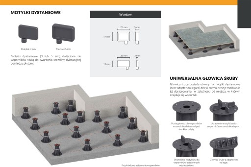 Wspornik regulowany pozwala przede wszystkim na dokładne dopasowanie wysokości podtrzymywanych płytek: wysokość reguluje się ręcznie.