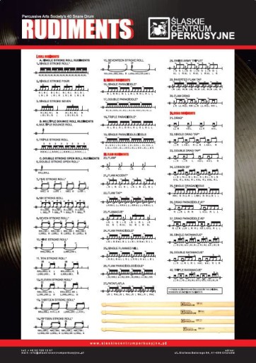 Plakat zawiera 40 rudymentów ogłoszonych przez Percussive Arts Society (P.A.S).