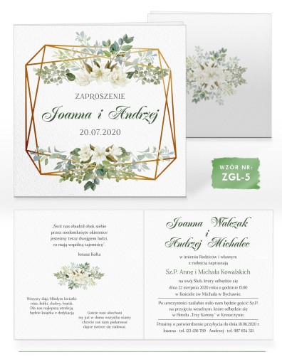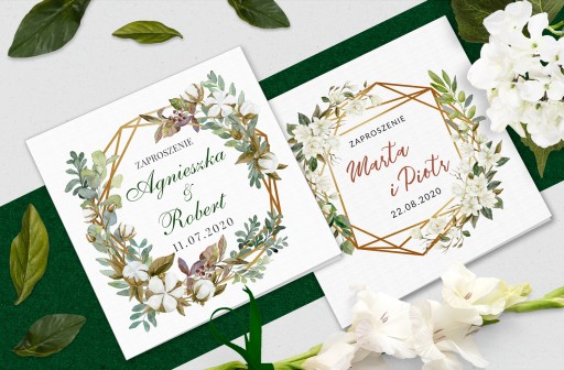 - Druk cyfrowy wybranego wzoru zaproszenia w formacie 140x280 mm (rozłożone), 140x140 mm (po złożeniu) wraz z elegancką kopertą w kolorze białym lub jasny écru.