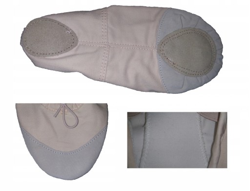Baletki są wykonane z miękkiego gęsto plecionego materiału, wzmocnionego na przodzie skórą. Dodatkowo baletki mają łatki skórzane na spodzie. Oprócz skrzyżowanych gumeczek są także gumki ściągające w lamówce co pomaga w idealnym dopasowaniu baletek do stopy. Nasze baletki wewnątrz posiadają wygodną, mięciutką wkładkę.
