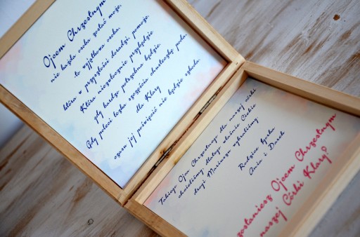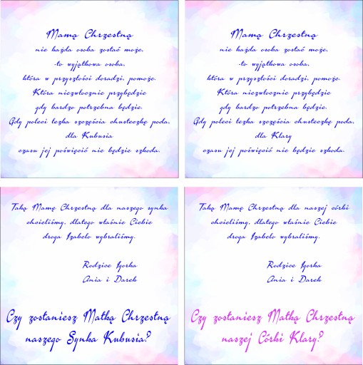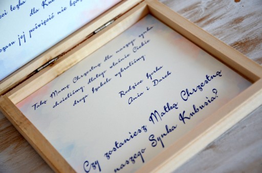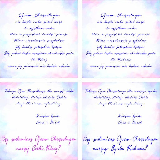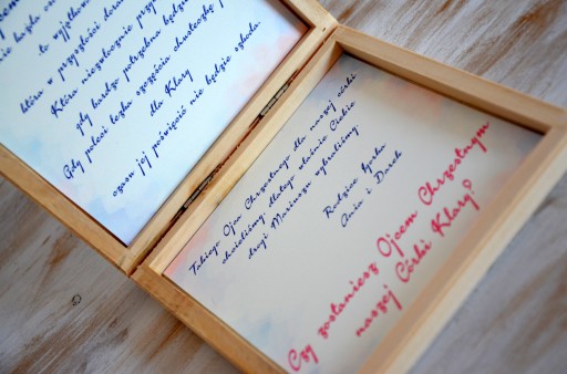 - Po zakupie przesłać do nas dane niezbędne do wykonania zamówienia: imię dziecka oraz jego zdjęcie, imię Ojca Chrzestnego, imię Matki Chrzestnej imiona rodziców oraz ewentualne uwagi do zamówienia