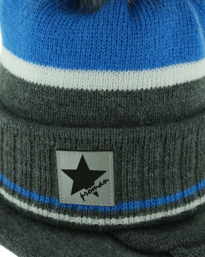 Czapka ciepła, dwuwarstwowa. Posiada osłonki na uszy i wiązania.