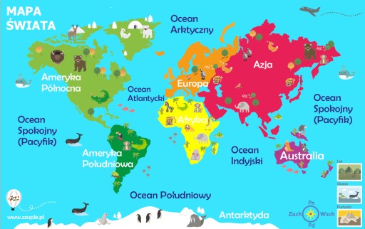 Edukacyjna Mapa świata z opisami kontynentów i oceanów oraz najbardziej popularnymi zwierzętami z danego rejonu.