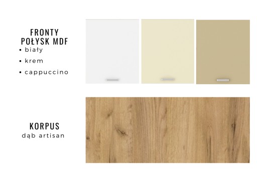 Front: płyta laminowana 16 mm dąb artisan / płyta MDF połysk 16 mm / obrzeże ABS