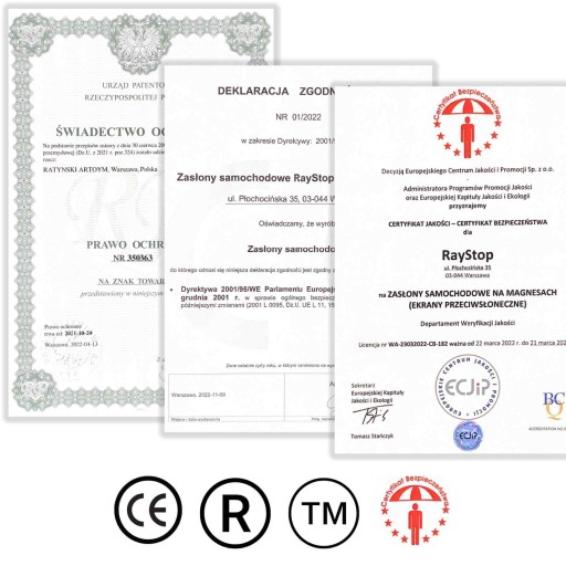 Wytwarzane przez nas zasłony przeciwsłoneczne posiadają oznaczenie CE co świadczy o tym, że spełniają wszystkie dyrektywy unijne oraz że zostały poddane stosownym procedurom oceny zgodności, które zakończyły się oceną pozytywną. Certyfikat Bezpieczeństwa potwierdza, że jako jedyne przedsiębiorstwo w kraju sprzedajemy Państwu zasłony wykonane z właściwych w 100% bezpiecznych dla zdrowia pasażerów, przetestowanych tworzyw.