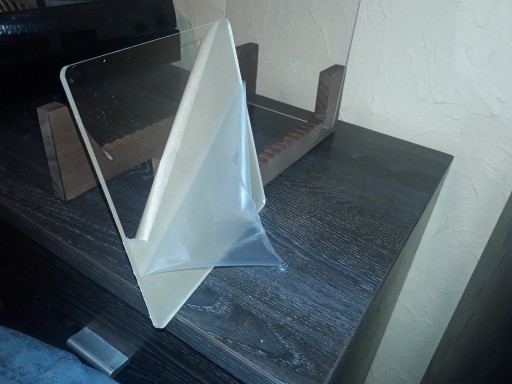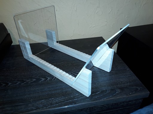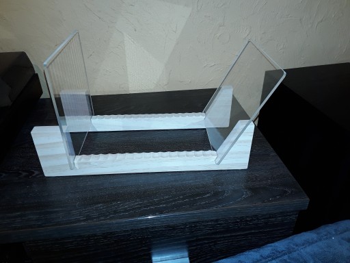 Stojak wykonany jest z jasnego drewna oraz plexi o max.wymiarach [dł,szer,wys] 37cm,18cm,18cm.