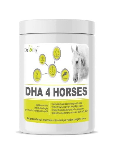 - DHA = kwas dokozaheksaenowy należy do niezbędnych kwasów tłuszczowych, których organizm sam nie jest w stanie wytworzyć, a może zostać pozyskany jedynie wraz z dietą. Wielokrotnie udowodniono, że długotrwałe podawanie koniom DHA ma pozytywny wpływ na zmniejszenie objawów astmy, RAO-nawracającej obturacji dróg oddechowych, IAD- zapalnej choroby dróg oddechowych. Głównymi źródłami kwasów tłuszczowych omega 3 są nasiona, orzechy, algi i ryby. Wykazano pozytywny efekt przy dawce 1,5 - 3 g DHA dziennie przez okres co najmniej dwóch miesięcy.