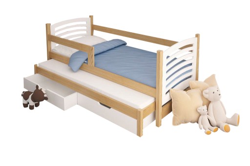 Łóżko parterowe wykonane z wysokiej jakości drewna sosnowego, charakteryzującego się wytrzymałością oraz łatwością w utrzymaniu czystości.