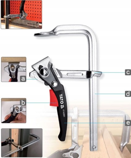 Ścisk z zapadkowym mechanizmem dociskającym. Gwarantuje bardzo silny, precyzyjnie stopniowany docisk szczęk. Stalowa konstrukcja zapewnia szybkie, stabilne mocowanie, odporne na skręcanie i wibracje.