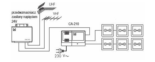 Zastosowanie Wzmacniacz CA-210 stosowany jest jako wzmacniacz abonencki w celu rozprowadzenia sygnału do kilku lub kilkunastu odbiorników. Podstawową cechą wzmacniacza jest praca w zakresie 40 - 400 MHz oraz 470 - 862 MHz. Dzięki niezależnej regulacji wzmocnienia w zakresie VHF i UHF możliwe jest dopasowanie wzmocnienia do poziomu sygnału w danym paśmie. Ułatwia to budowę instalacji antenowych wykorzystujących jeden kabel do sprowadzenia sygnałów z wszystkich anten (po zsumowaniu za pomocą zwrotnicy).