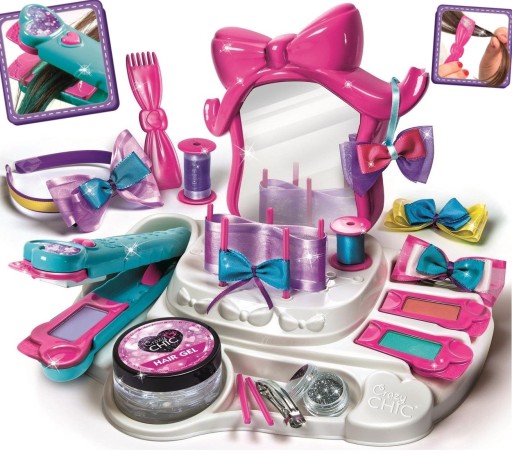 Zestaw kosmetyków do tworzenia fryzur, które zawsze są modne - idealny dla małej stylistki. Dziewczynka znajdzie tu niezbędne akcesoria, które pozwolą jej stworzyć wystrzałową fryzurę. Salon fryzjerski ma duże lustro, paletę do farbowania włosów i fantastyczny błyszczący żel. Paleta ma szereg otworów i szpilek w różnych rozmiarach, aby pomóc w tworzeniu kokardek i kokard do przymocowania do spinek i opasek na włosy. W zestawie są 3 proszki do włosów w kolorze fioletowym, w kolorze fuksji oraz w kolorze akwamaryny, dzięki którym każda mała stylistka poczuje się wyjątkowo. Sztuka stylizacji włosów jest w zasięgu ręki!