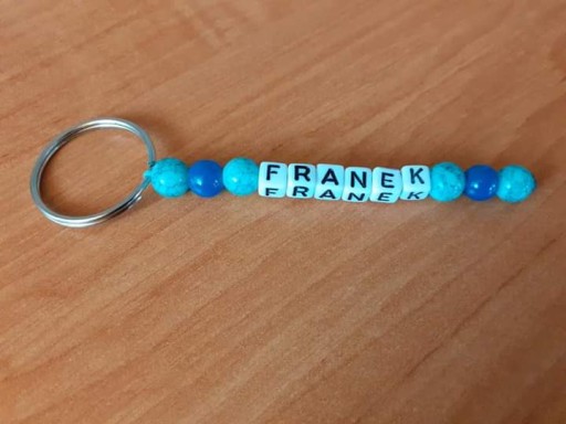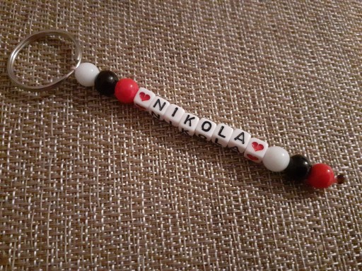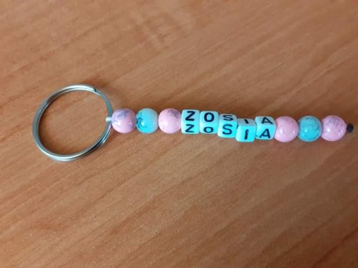 Breloczek wykonany na kółku do breloczka i sznurku, z koralików 8mm i literek akrylowych.