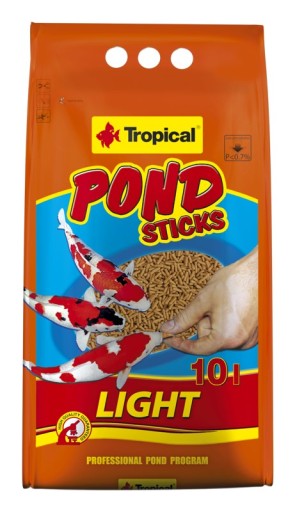 POND STICKS LIGHT wieloskładnikowy pokarm w formie pływających pałeczek, przeznaczony dla karpi koi i innych gatunków ryb w stawkach ogrodowych. Pokarm wyprodukowano z komponentów roślinnych najwyższej jakości (w tym kukurydzy o wysokiej zawartości karotenoidów) i mączki rybnej bogatej w białko i nienasycone kwasy tłuszczowe (NKT). Doskonale zbilansowany skład pokarmu POND STICKS LIGHT dostarcza rybom niezbędną dawkę energii, zapewniając im odpowiedni wzrost, a jednocześnie obniżając ryzyko otyłości. Obniżona zawartość fosforu zmniejsza dopływ tego pierwiastka do oczka wodnego wraz z pokarmem, redukując w ten sposób ryzyko zakwitu glonów. Pokarm stosujemy od wczesnej wiosny do późnej jesieni, w temperaturze wody powyżej 10°C oraz podczas zimowania ryb w pomieszczeniach zamkniętych.