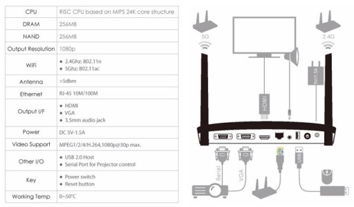 Urządzenie zostało wyposażone w dwie anteny Wi-Fi obsługujące sieci 802.11n 2.4Ghz i 802.11ac 5Ghz, aby zapewnić wysoką przepustowość i stabilne połączenie. Przesyłaj obraz w czasie rzeczywistym bez opóźnień. EZCast Pro Box B02 pozwala na transmisję w odległości do 15 metrów (rzeczywisty zasięg zależy również od czynników zewnętrznych, takich jak np. ściany, inne urządzenia sieciowe itd.)