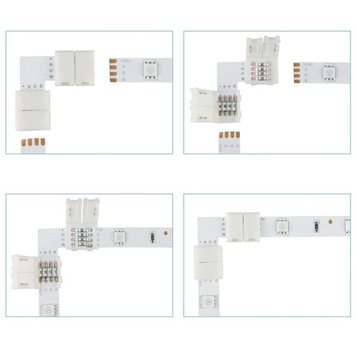 Ręcznie zaciskana złączka narożna do taśm LED RGB z 4 punktami lutowniczymi. Pozwala na szybkie łączenie dwóch taśm LED SMD 5050 o szerokości 10mm na narożnikach bez konieczności używania lutownicy. Wystarczy odpowiednio umieścić taśmę oraz zamknąć zatrzask . Złączki można bez trudu zdjąć. Są wielokrotnego użycia. Złączkę można zacisnąć na taśmie RGB zwykłej lub wodoodpornej (po wcześniejszym usunięciu osłony silikonowej).