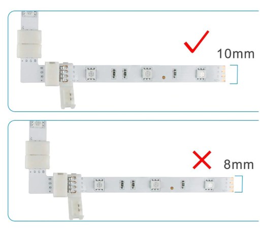 Ręcznie zaciskana złączka narożna do taśm LED RGB z 4 punktami lutowniczymi. Pozwala na szybkie łączenie dwóch taśm LED SMD 5050 o szerokości 10mm na narożnikach bez konieczności używania lutownicy. Wystarczy odpowiednio umieścić taśmę oraz zamknąć zatrzask . Złączki można bez trudu zdjąć. Są wielokrotnego użycia. Złączkę można zacisnąć na taśmie RGB zwykłej lub wodoodpornej (po wcześniejszym usunięciu osłony silikonowej).