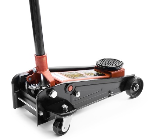 - Praktyczny podnośnik samochodowy, wyposażony w koła jezdne, dzięki czemu łatwo się go przemieszcza.