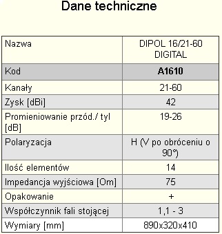 DIPOL 16/21-69 jest anteną kierunkową, przystosowaną do odbioru naziemnej telewizji cyfrowej DVB-T. Zysk anteny wynoszący 42dBi pozwoli na odbiór sygnału z nawet bardziej oddalonych nadajników telewizyjnych. Kompaktowe wymiary oprócz większych możliwości montażowych (np. na balkonie), zapewniają brak problemów związanych z długoletnią eksploatacją (mniejsza podatność na wpływ wiatru, itd.). Antena posiada wbudowany wzmacniacz LNA-177 Główne elementy anteny wykonane są z aluminium. Konstrukcja puszki umożliwia stosowanie standardowych wzmacniaczy płytkowych typu LNA.