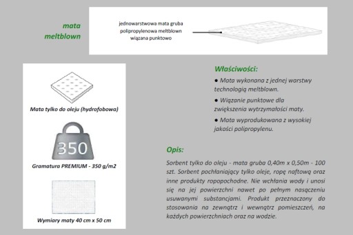 Sorbent olejowy rolka PREMIUM (gruba) - 76 cm x 46 m pochłaniająca tylko oleje, ropę naftową oraz inne produkty ropopochodne. Nie wchłania wody i unosi się na jej powierzchni nawet po pełnym nasączeniu usuwanymi substancjami. Produkt przeznaczony do stosowania na zewnątrz i wewnątrz pomieszczeń, na każdych powierzchniach oraz na wodzie. Mata wyprodukowana nowoczesną technologią MeltBlown. Rolka perforowana na całej długości umożliwia podzielenie na odcinki.